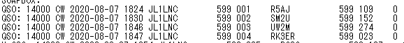 thanks for participation in WAE-CW. Seems, that your log is not correct. Please check THE DATE OF YOUR QSOS ! You have QSOs 7th/8th/9th of August in your log !!!!???? The contest took place 8th and 9th of August…….!!!!! 🙂 🙂 🙂