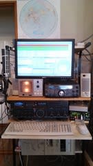 その上にあるPCディスプレイは、もともとの脚をはずして、自在アームでちょうど2段目無線機類の上に来るよう設置。