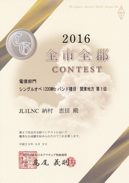 コンテスト全市全郡賞状 2017年5月12日2025年9月13日 - Leave a Comment キタ。 関東1位、って、リザルト見たらダントツなんだけど、どうやら1200から上は全国って括りは無いみたい。