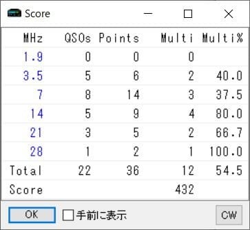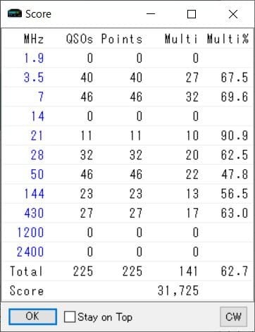 このオール神奈川はシングルバンド部門でエントリー出来るバンドが限られていて、県内局なのでいろいろたくさん交信したいと思い不慣れながらもマルチバンド部門。