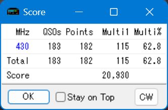コンテスト第43回関東UHFコンテスト 2026年3月12日2026年2月11日 - Leave a Comment ##2026年2月11日(水祝) けっこう出来た。 ほぼ自己レコード😀。 ■電信シングルオペ430MHzバンド でも、しばらくはコンテストお休みかな。。。。。 😌
